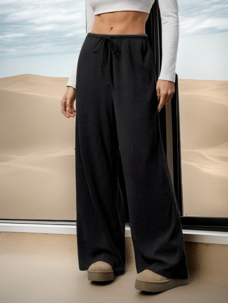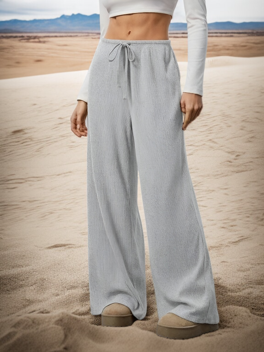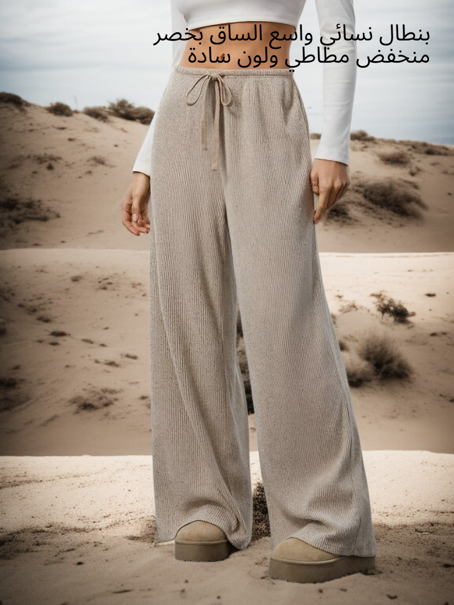 بنطال نسائي واسع الساق بخصر منخفض مطاطي ولون سادة