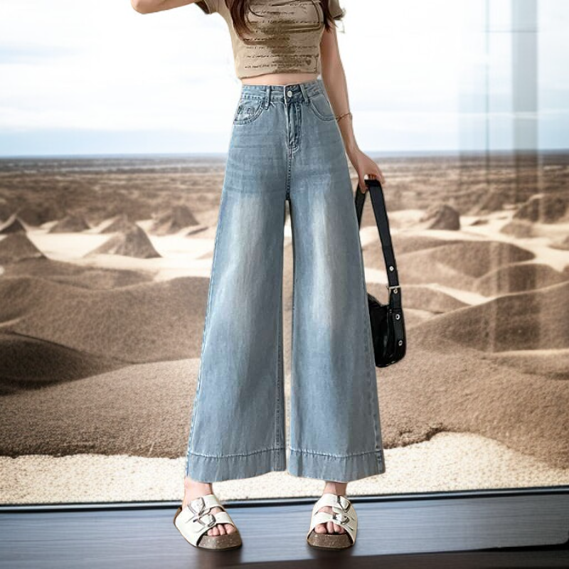 بنطال جينز نسائي واسع الأرجل بخصر عالي من قماش التنسل